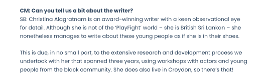 A brief but lovely shoutout to Christina in the Lewisham Ledger, after the debut of her play: PlayFight.